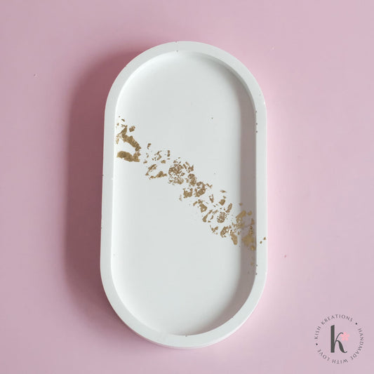 Oval Trinket Tray | Elegant White with Gold Flakes Design