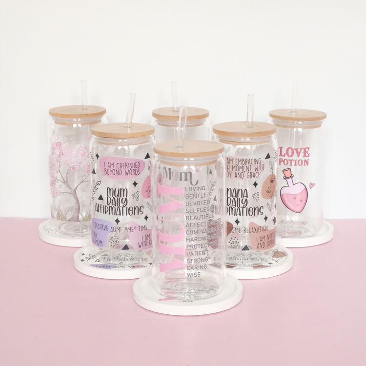 - Includes 1 16oz Libbey glass with bamboo lid and plastic straw + 1 matching handmade coaster